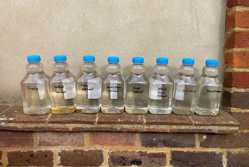 Samples from different stages through the water recycling centre taken in spring 2022 before the reedbed started operating. Crude sewage samples are on the left with river samples upstream and downstream of the discharge point on the right.